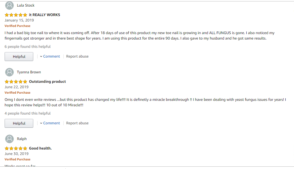 This product has been received well by the target consumer. Most of the reviews and testimonials they leave on websites that sell it point towards a good product. The positive assessments play a significant role in propelling the sale of Urgent Fungus Destroyer. The screenshot below shows some of the reviews left on Amazon.